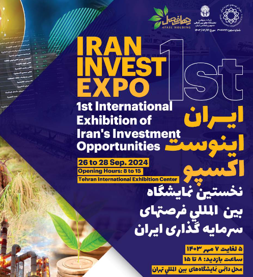 اولین نمایشگاه بین المللی فرصت های سرمایه گذاری با عنوان Iran Invest Expo 2024 در محل دائمی نمایشگاه‌های بین المللی تهران طی تاریخ 7-5 مهرماه 1403 ( برابر با 28-26 سپتامبر 2024) برگزار می‌گردد.